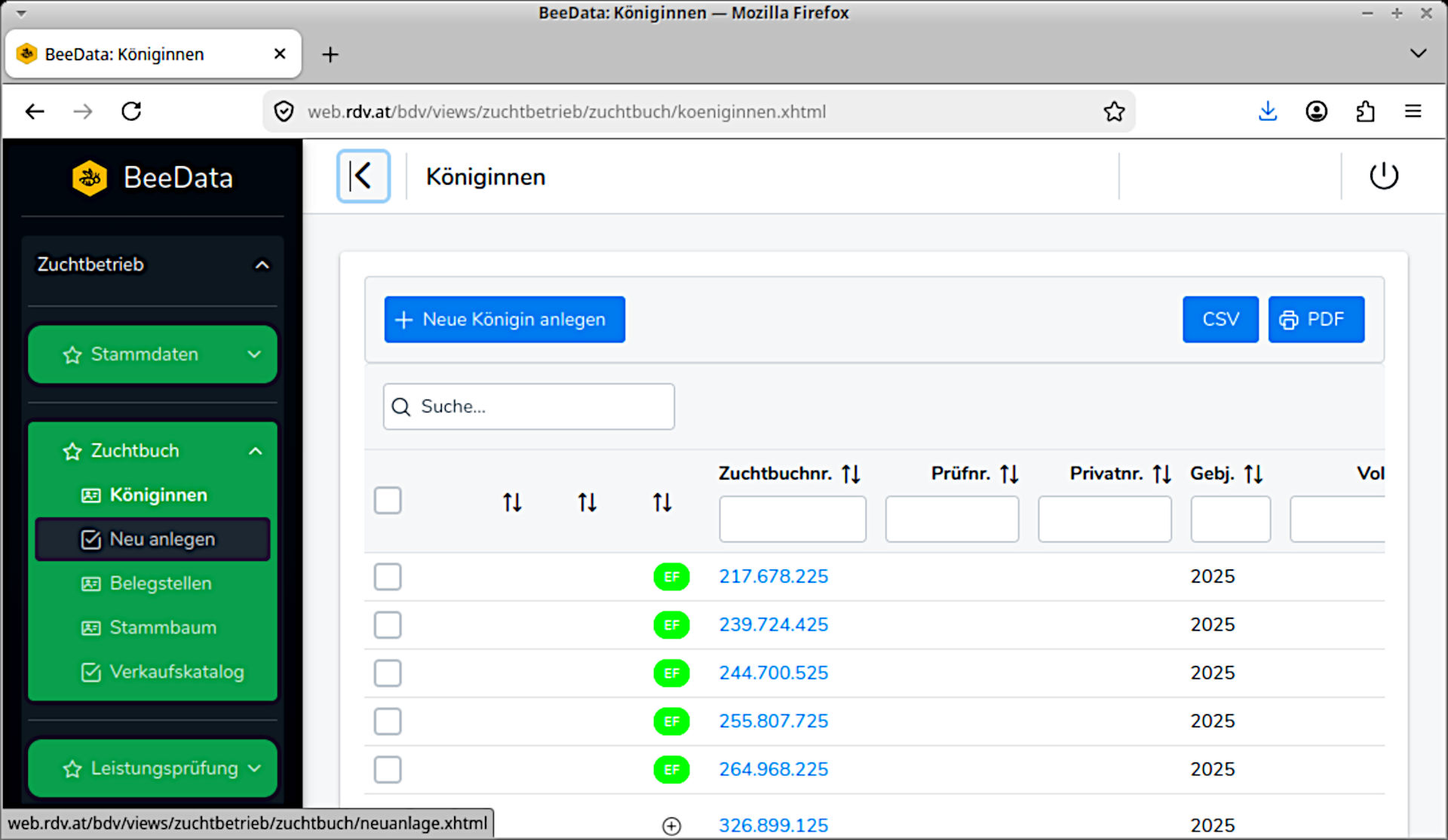 Für eine Liste der eigenen Prüfköniginnen bitte auf Bee-Data einloggen: Leistungsprüfung > Zuchtwerte > 2024 auswählen (Häkchen setzen).